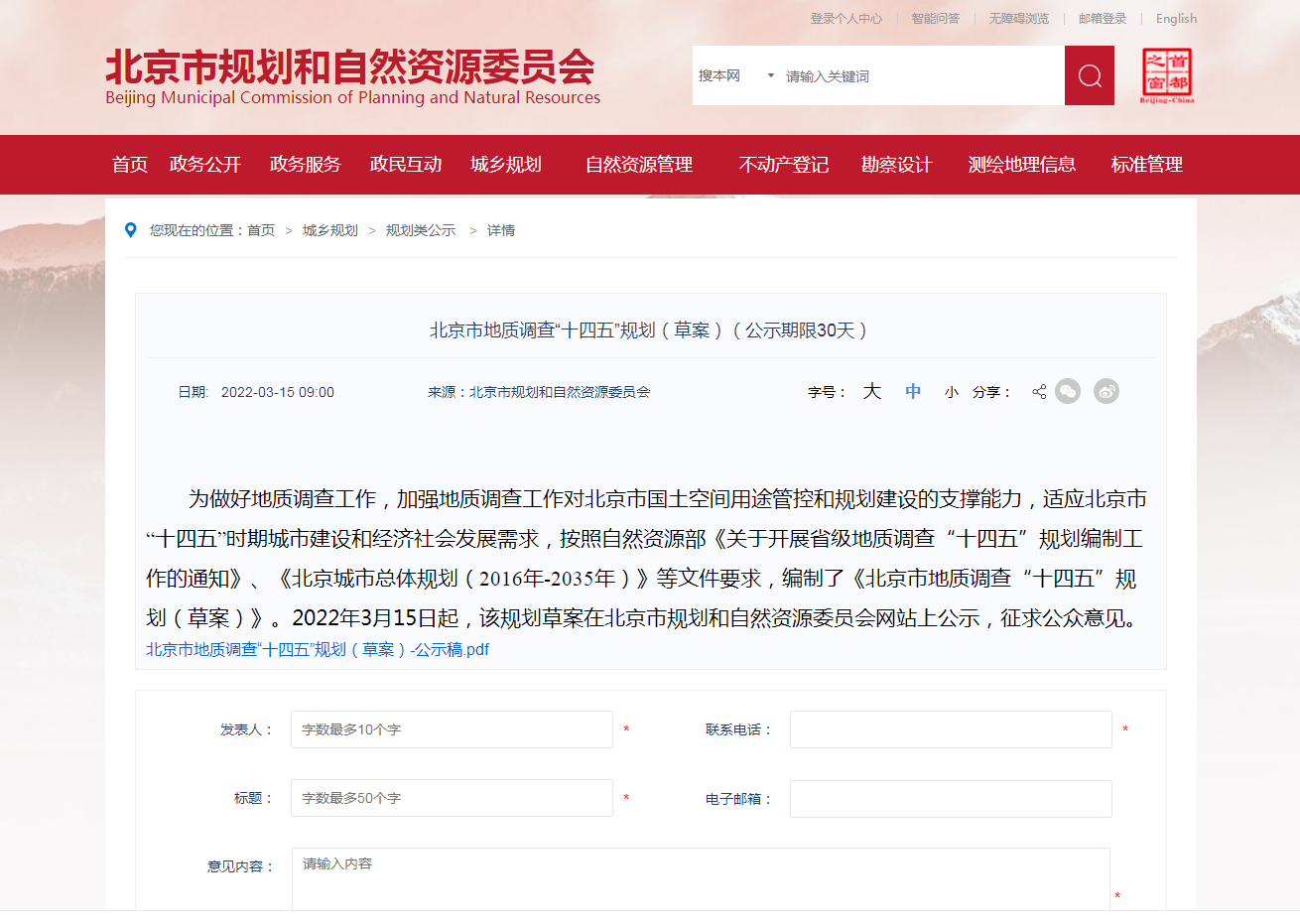 地大熱能地熱+多能互補網訊:《北京市地質調查“十四五”規劃(2021—2025年)(草案)》(以下簡稱《草案》)3月15日起在市規劃自然資源委網站公示,聽取公眾意見,公示期30天?!?a href="http://m.yg06.cn/t/規劃.html" >規劃》提出,北京市將率先對首都功能核心區地熱能等開展綜合地質調查評價,提供地質安全保障。社會公眾對該《規劃》如有意見建議,可在4月14日前登錄北京市規劃自然資源委網站留言。