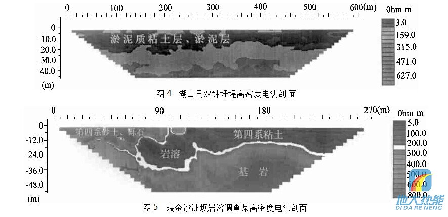 (3)高密度電法劃分地層 2000年4月初,在建中的湖口縣雙鐘圩堤部分堤段滑塌。事故發(fā)生后我院在該堤段進(jìn)行了綜合物探勘察,為分析滑塌地質(zhì)原因提供了基礎(chǔ)地質(zhì)資料。雙鐘圩堤壩體填土層約7m,其下部為淤泥質(zhì)粘土層與淤泥層,淤泥層下部為泥盆系五通組砂巖。