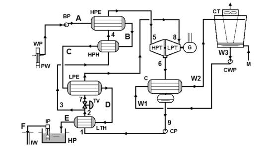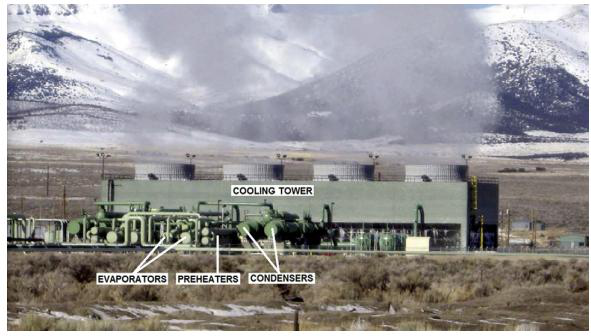 最新的USGeo拉夫特河發(fā)電站坐落在起初的電站南南東方向約600m的地方。這個(gè)最新的發(fā)電機(jī)組的能量對(duì)流系統(tǒng)是一個(gè)部分回?zé)幔?jí),雙壓力雙循環(huán)發(fā)電機(jī)組。有兩個(gè)單獨(dú)的單元,每一個(gè)單元都有兩個(gè)軸向流動(dòng)的渦輪來驅(qū)動(dòng)同一個(gè)中心發(fā)電機(jī)。一個(gè)四室的水冷卻塔為殼管冷凝器(shell-and-tube condensers)提供冷卻提供冷卻水。補(bǔ)充水是從水井中獲取的,而且需要及時(shí)處理來維持冷卻塔中的水的質(zhì)量。138℃的鹵水以大約3.15×106kg/s的速度泵向蒸發(fā)器和預(yù)熱器,循環(huán)工質(zhì)異戊烷(i-C5H12)就是在蒸發(fā)器和預(yù)熱器中吸收溫度的。換熱器只在高壓循環(huán)中才使用。