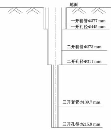 如圖所示,該孔采用三開結構,一開0~30m,井徑為445mm;二開30~500m,井徑311mm;三開500~350 m,井徑215.9mm。0~ 30m下入Φ377mm護壁管;0~500m下入Φ273mm套管作為出水管及泵室管;500~3500m下入Φ139.7mm套管作為出水管及濾水管。