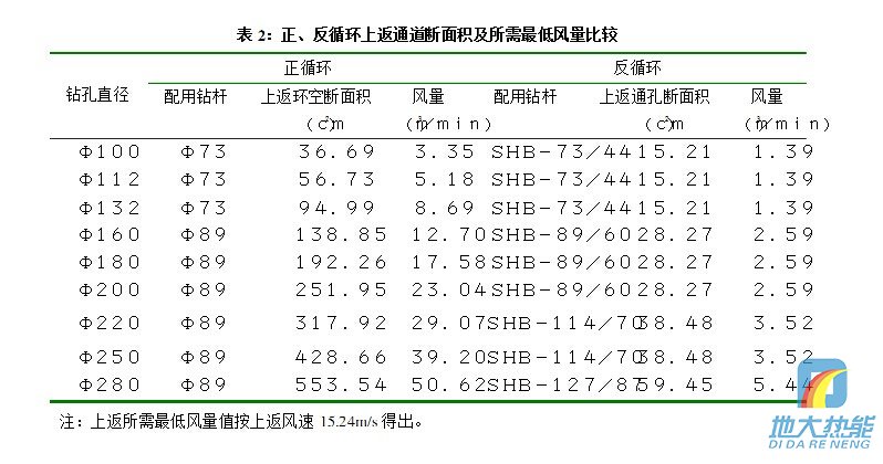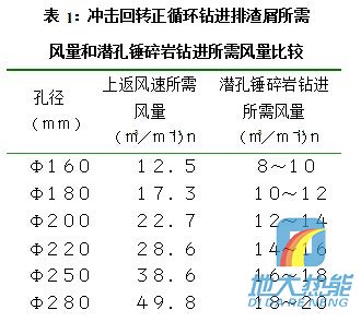 基巖水井通常口徑為Φ160~Φ280mm之間,該口徑硬巖的鉆進(jìn)效率低,成本高,施工周期長(zhǎng),成為鉆探界亟待解決的難題。20世紀(jì)70年代開始,我國(guó)已引進(jìn)潛孔錘技術(shù)應(yīng)用于水井鉆鑿,鉆進(jìn)效率數(shù)倍提高,展示了潛孔錘鉆進(jìn)的良好前景。但水井工程,孔深大,背壓高,配套使用的空壓機(jī)不但風(fēng)量要求大,風(fēng)太也高,使鉆進(jìn)成本大幅度增高。主要矛盾是滿足排渣屑上返風(fēng)速的要求時(shí),供風(fēng)量巨大,遠(yuǎn)超過(guò)了潛孔錘本身工作的需求。計(jì)算不同孔徑條件下滿足上返風(fēng)速15m/s供風(fēng)量的需求,見表1(Φ89鉆桿為例)。表1數(shù)據(jù)表明,孔徑越大,為滿足排渣屑要求而消耗的能量越大,經(jīng)濟(jì)性越差。若實(shí)施反循環(huán)鉆井技術(shù)工藝,則排渣屑所需風(fēng)量大大減小,如表2所示。